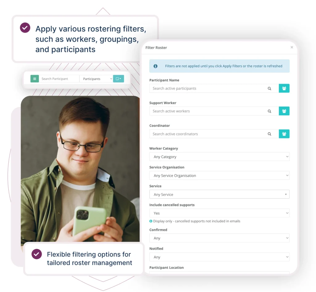 Support lists in CareMaster offer convenient filtering options to enhance your Participant management experience. You can effortlessly narrow down the list on this online roster software based on various criteria, such as the date range of support, whether it has been checked or not, payment status (paid or unpaid), specific locations or regions, appointments that are cancelled or scheduled for the future, notifications and confirmations received, as well as the ability to filter supports by service organisations and service types. These versatile filters enable you to efficiently navigate and organise the support information according to your specific needs, allowing for streamlined Participant management within the CareMaster Software.